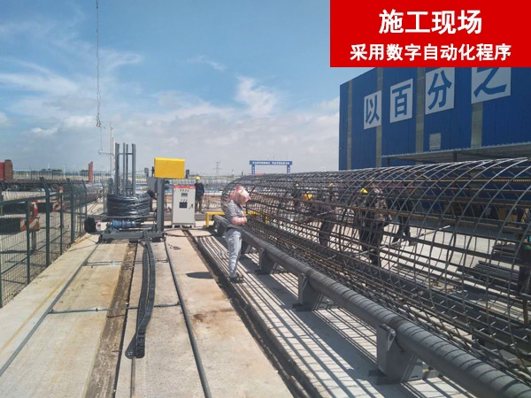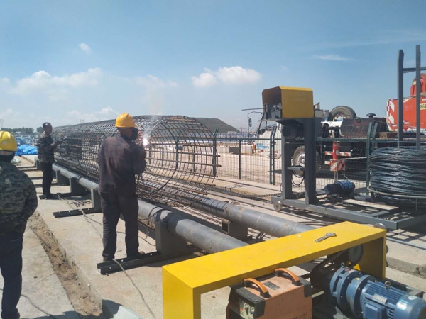 2、鋼筋籠12米以上,或者單節(jié)鋼筋籠較重時,骨架中間加焊1、2圈纏繞筋替代第三個過渡箍?;蛑苯又虚g開始繞筋,另半截籠前面向中間纏繞連接完成。所以三個過渡箍的中間一個箍應置放在中間靠后面的地方,借以減少沖擊振動。退出輥輪并過渡到后面輥輪的方法--將過渡箍向后面推壓,讓過渡箍順膠輥旋轉到上面直到全部退出。準備臺架;若采用骨架直接滾進輥輪內檔(小型鋼筋籠),骨架制作臺架高度與設備同高。